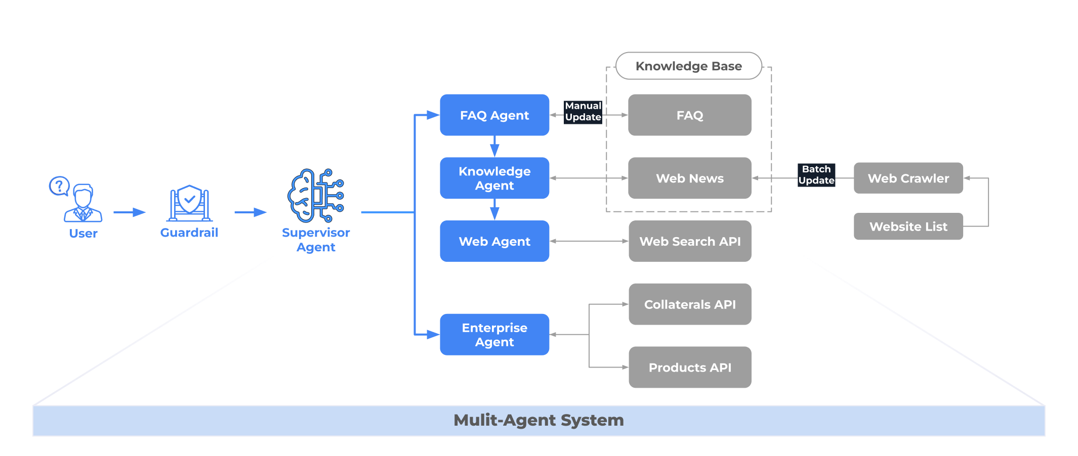 This diagram highlights a Hierarchical MAS architecture, where a Supervisor Agent orchestrates specialized Task Agents to ensure governed, high-quality responses—ideal for risk-sensitive environments. It is one of several configuration models that can be applied based on your specific operational goals.
